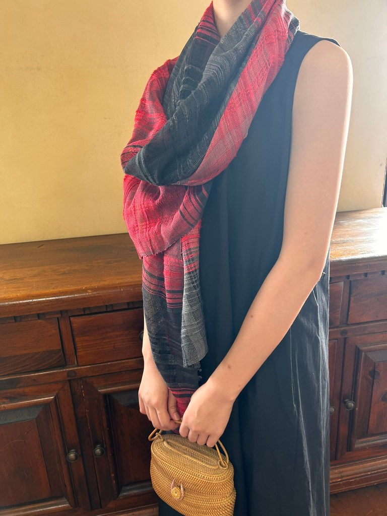 ・二巻きで:首元に沿ってすべりにくく、黒の面積が増えて落ち着いた印象に。赤は差し色として静かにのぞきます。
