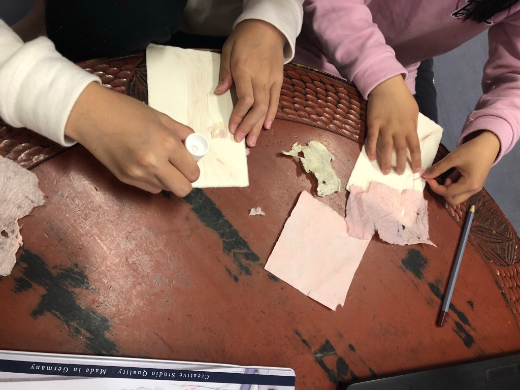 カーネーションとボケ、椿、水仙で染めた和紙をちぎって貼っていきます。