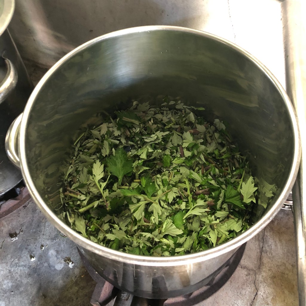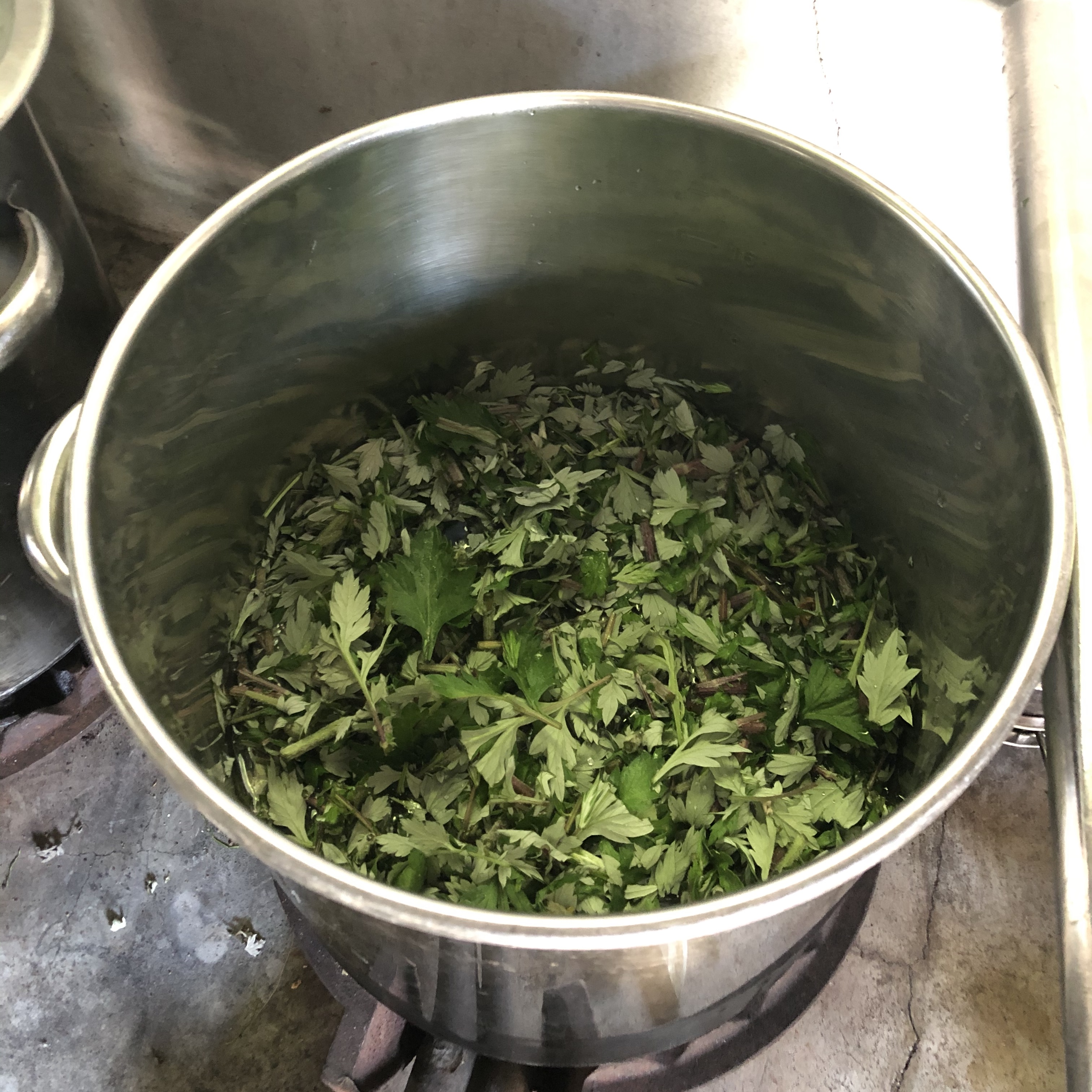 工房では毎年ヨモギの若葉でよもぎ餅や蒸しパンを作り、茎や葉で染色をします。そして、今年は初めてヨモギバームを作りました。
