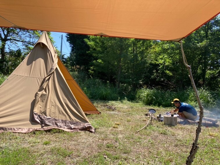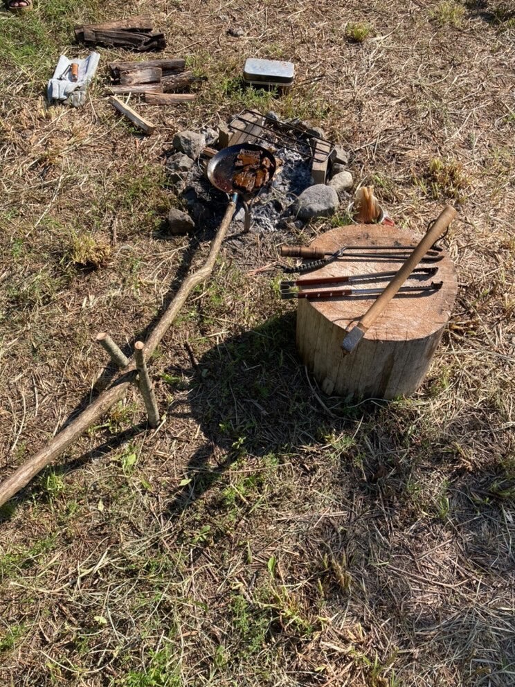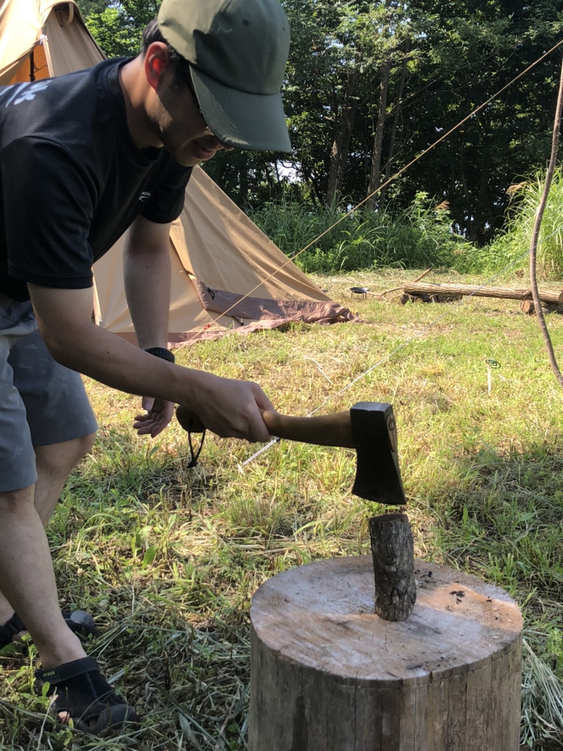いろいろと相談をして、テント、タープの張り方を協力して行い、薪集め、斧を使って薪割り、ナイフの使い方、火打ち石を使った火起こし、焚き火を囲んで、ちょっとしたクラフトをして、焚き火料理にも挑戦しました。