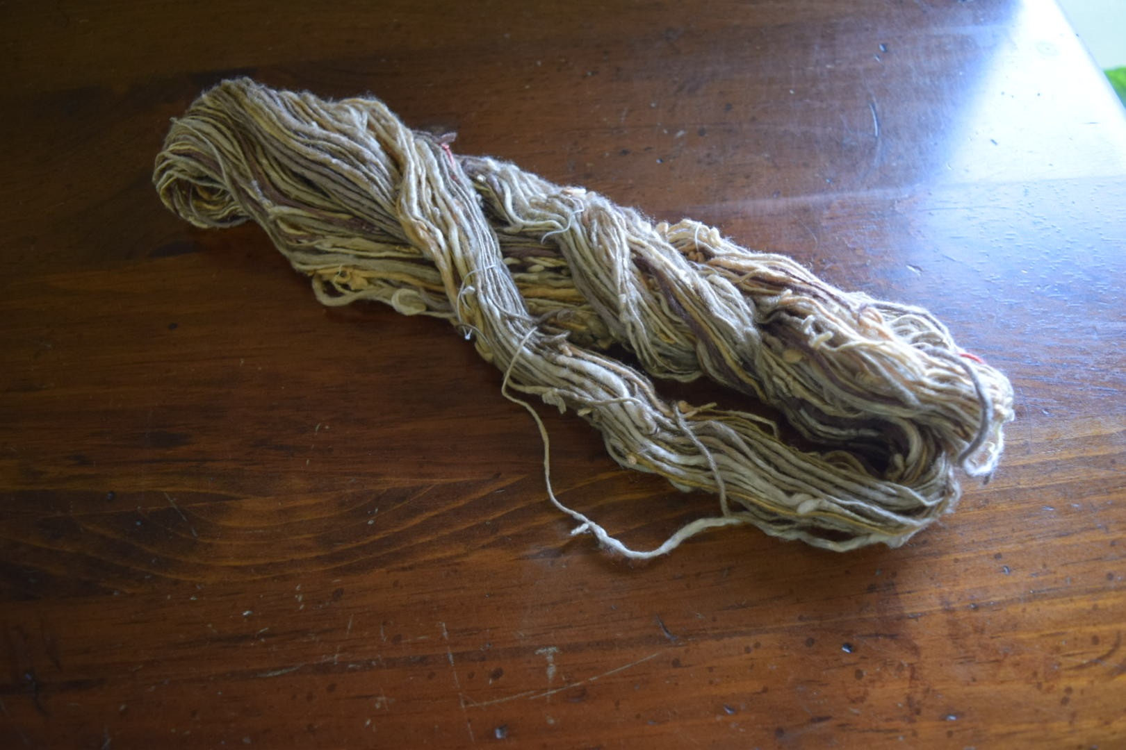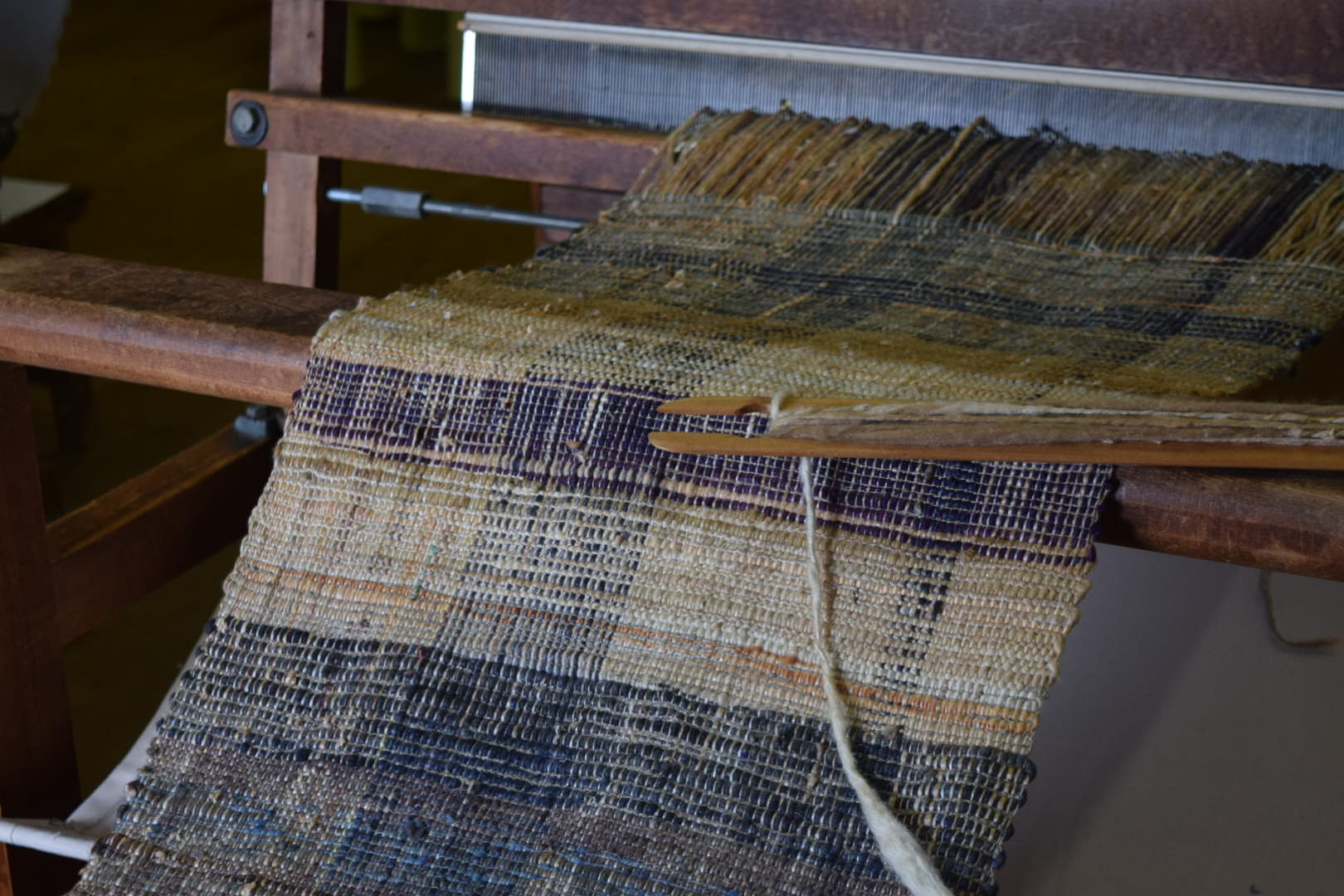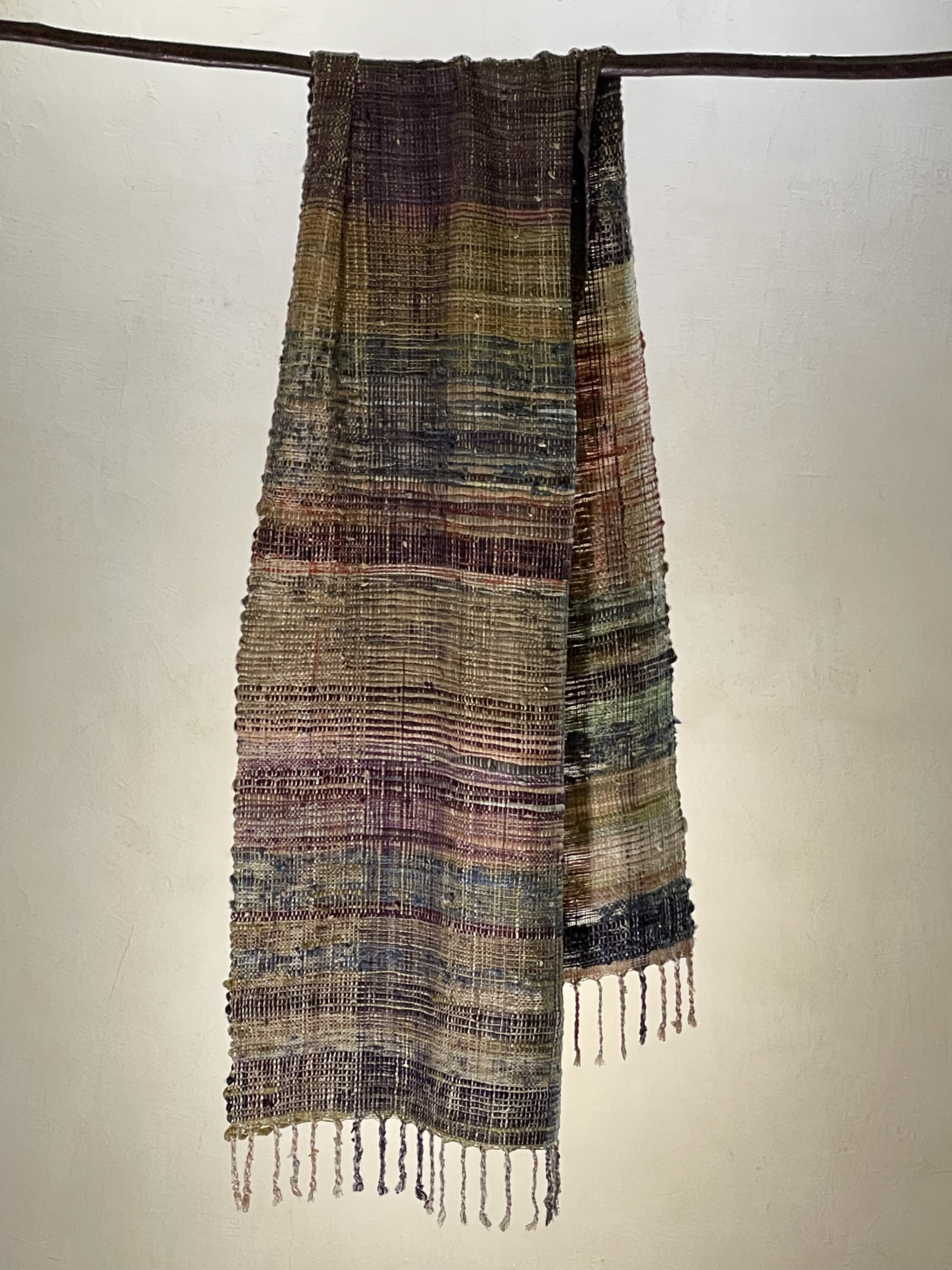 この作品は、織り終わった後にでた経糸や緯糸の残糸を大切にとっておき、その集まった糸を一本一本繋ぎ合わせ、再度経糸の糸にしました。
