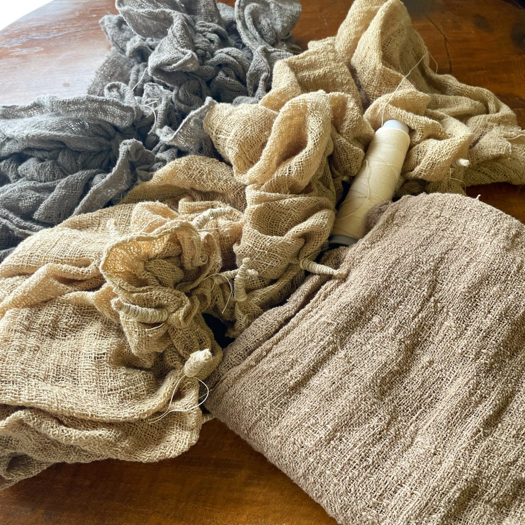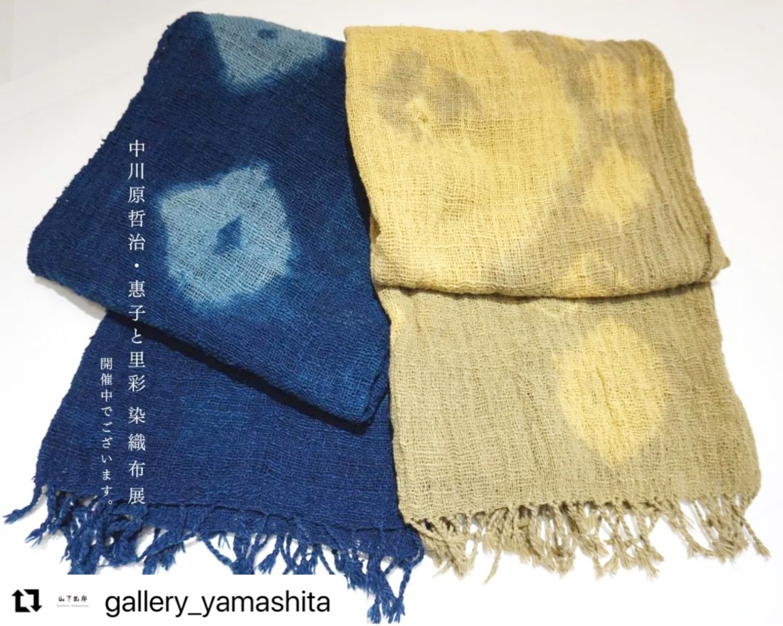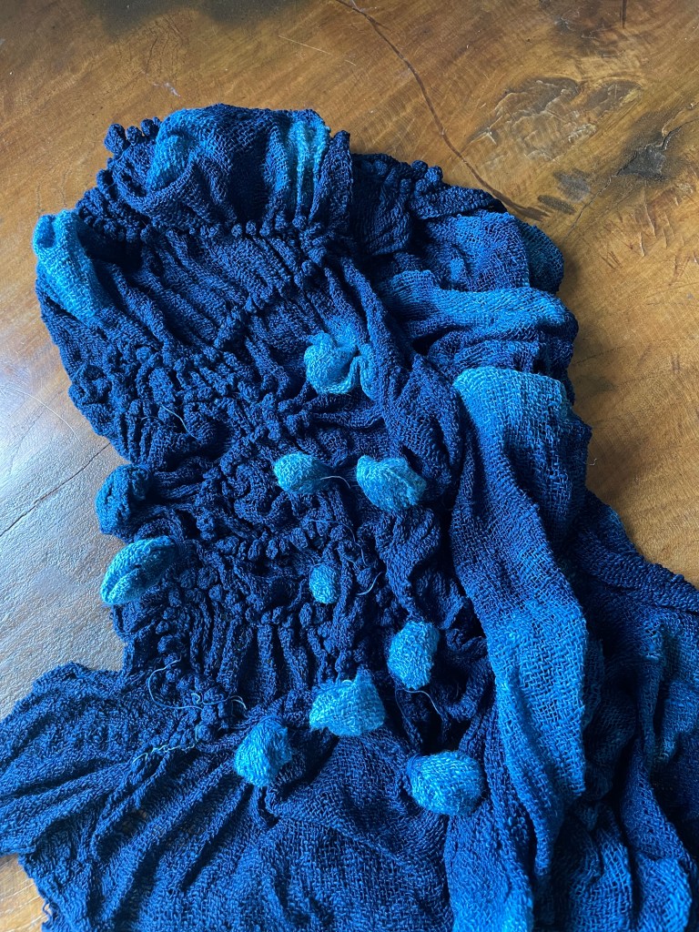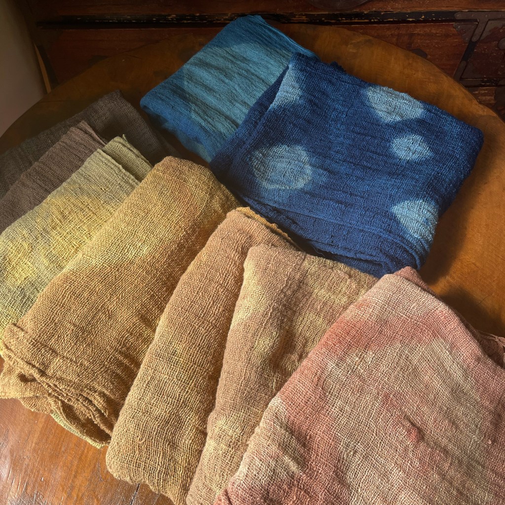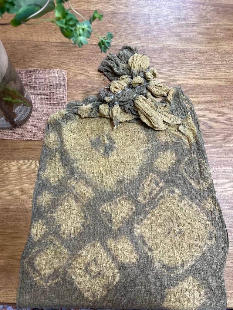 織りのゆるい布だし、植物で染めるので思うようには絞り染めができませんが、その都度、その時の気分と共に様子をみながら進めていきます。