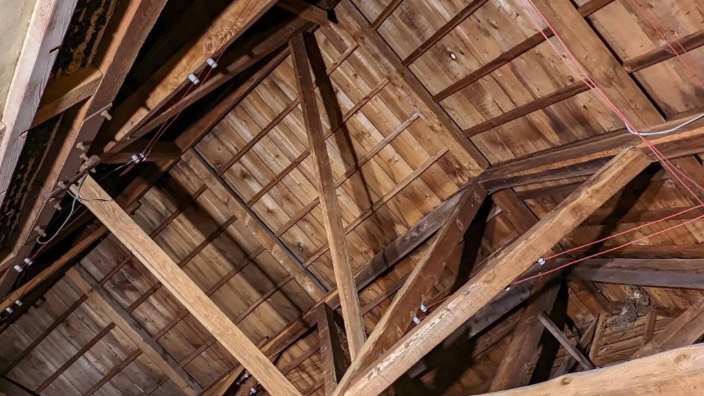 数年前、瓦屋根が壊れていた時に雨漏りがひどく、随分と天井まで水が貯まってしまい板がボロボロになっている場所が数カ所あります。