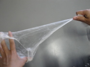 木綿(コットン)と違って、繊維が長く途切れないので、そのまま引っ張ると糸になります。