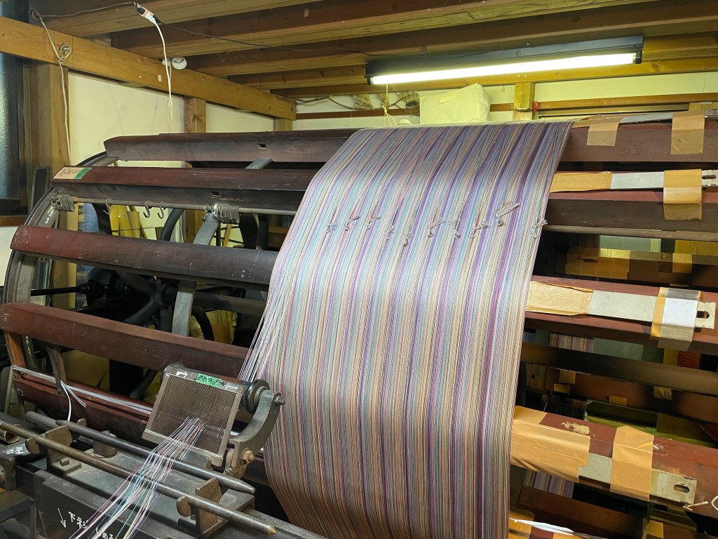さらに、手動のような自動のような完璧ではない整経機なので、糸が切れたりなくなったりした時は自分達で気が付かなくてはならず神経を張り詰めての作業です。