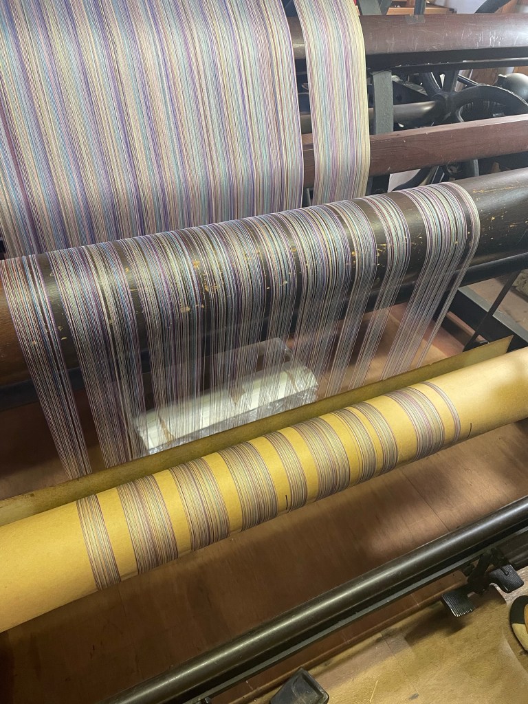 いろいろと手間がかかる機械ですが、古い機械の良さがたくさんあります。例えば好きな場所で経糸の色を替えてみたりなど、気軽に自由にアレンジができるので私共の工房では貴重な整経機です。