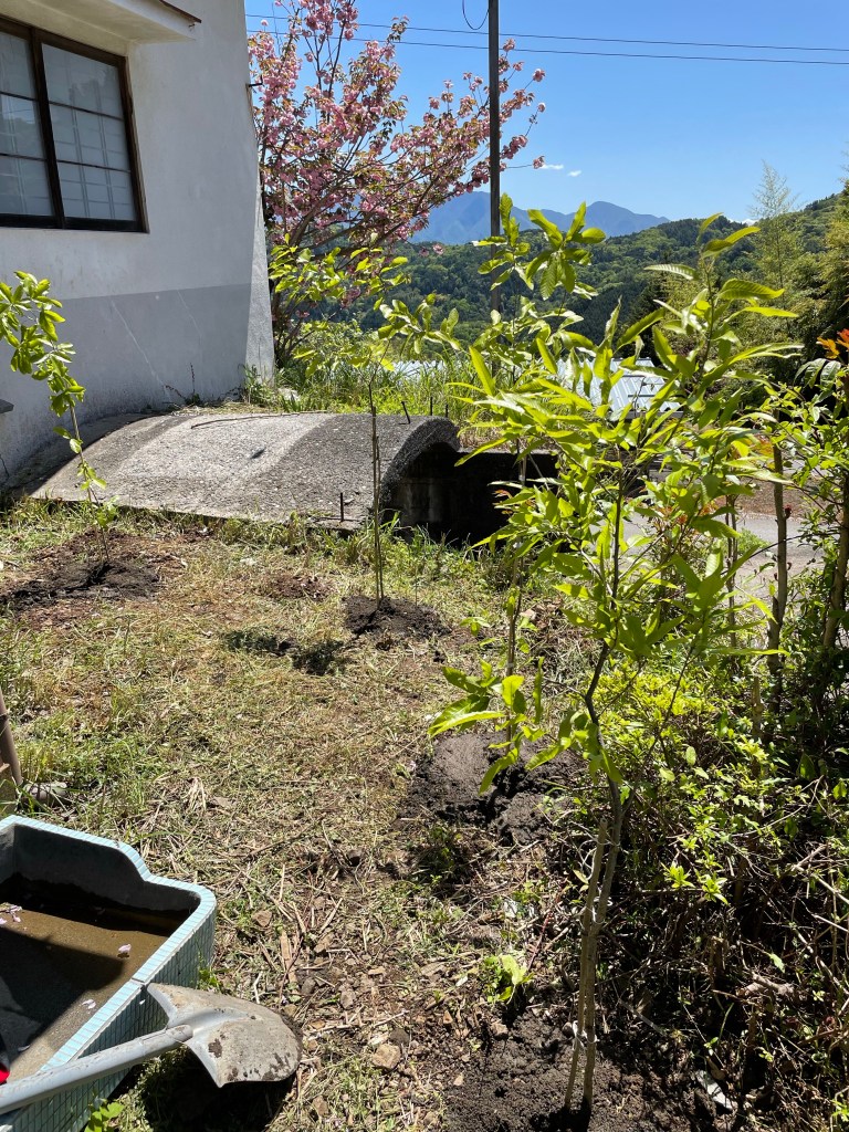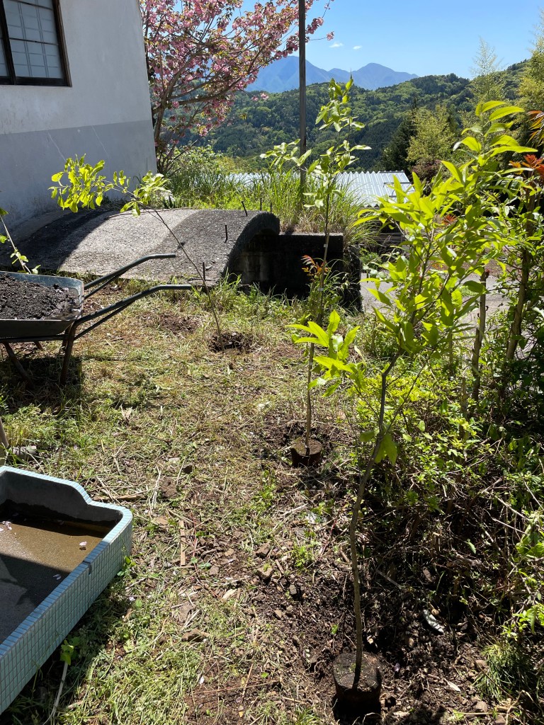 穴を掘り、たっぷりの水を入れ、そこへ苗木を入れます。土の栄養も良さそうなので、肥料は入れずに植えました。肥料は入れすぎてもよくないそうなので・・・。