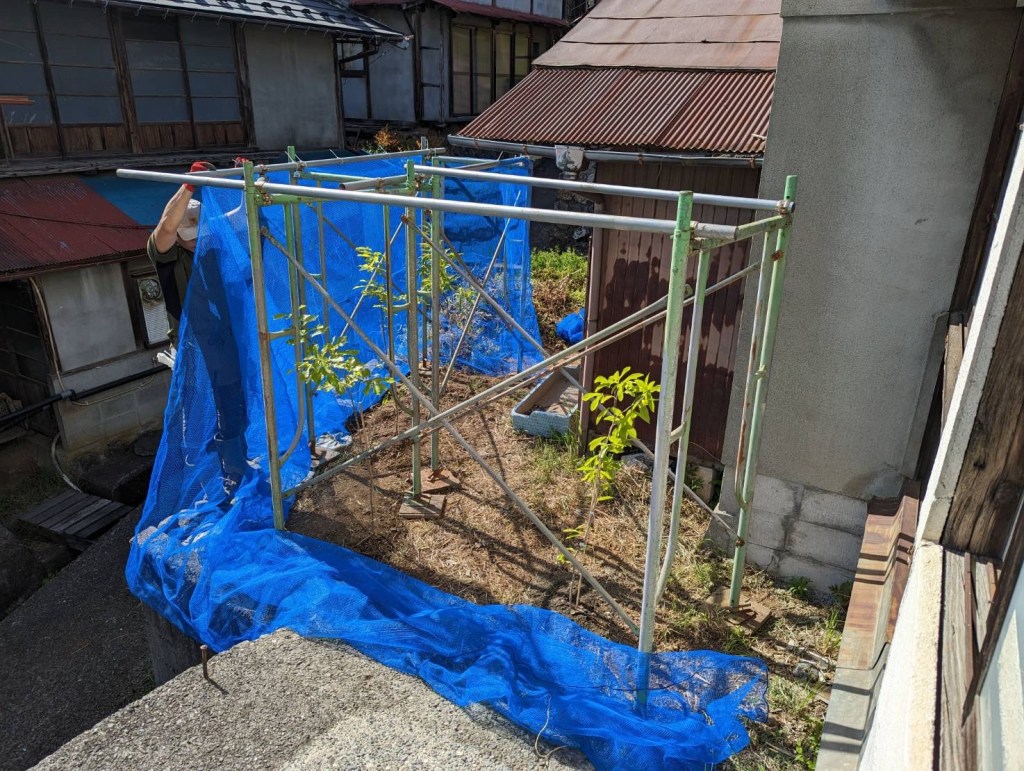風が抜ける場所なので、とりあえずたくさんある足場を利用してネットをかけましました。
