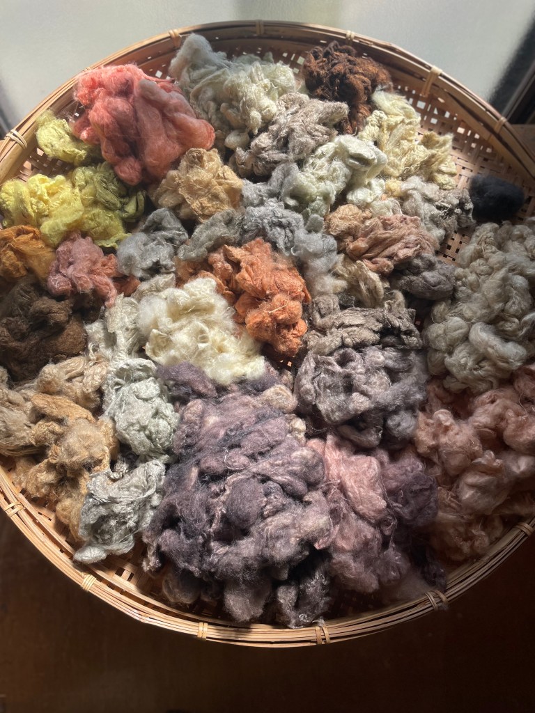 You will choose your favorite color from about the 30 colors of flossy silk that have dyed so far and spin them.