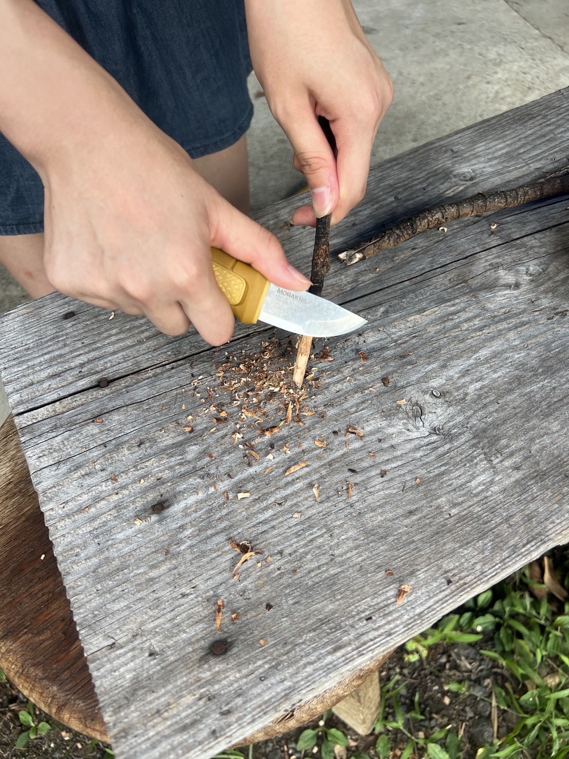 乾燥したぶどうと枇杷の枝を、ナイフで削ります。ついでに、焚き火料理用の薪割りもしました。薪を割るときに木を固定する道具があるので、子どもでも安全に木を割ることができます。木によって堅さが違うので、なかなか割れない木もありますが・・・。
