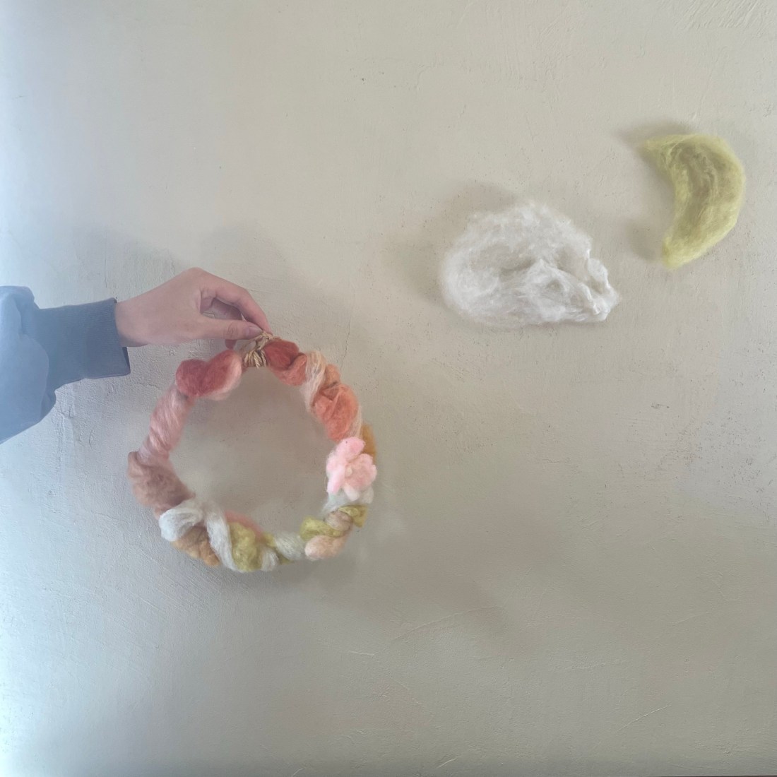 伸ばした真綿をリース台に軽く巻きつけ、はずれないようにからませていきます。厚みを出したい部分は重ね、薄くしたい部分は少し引き伸ばして調整します。 - 仕上げる