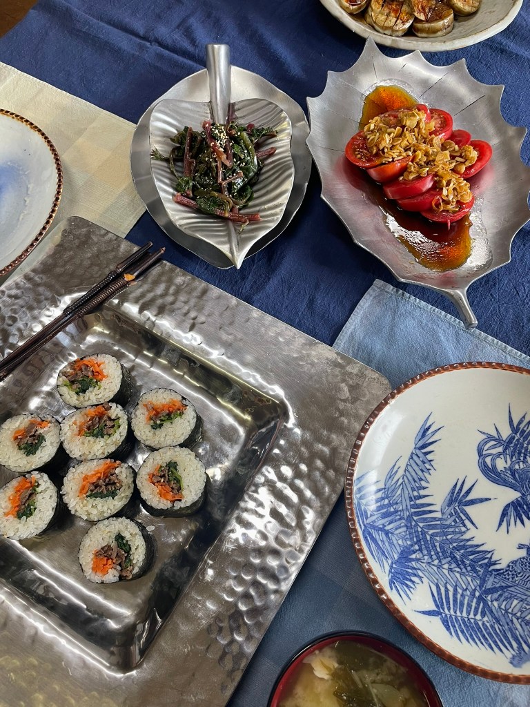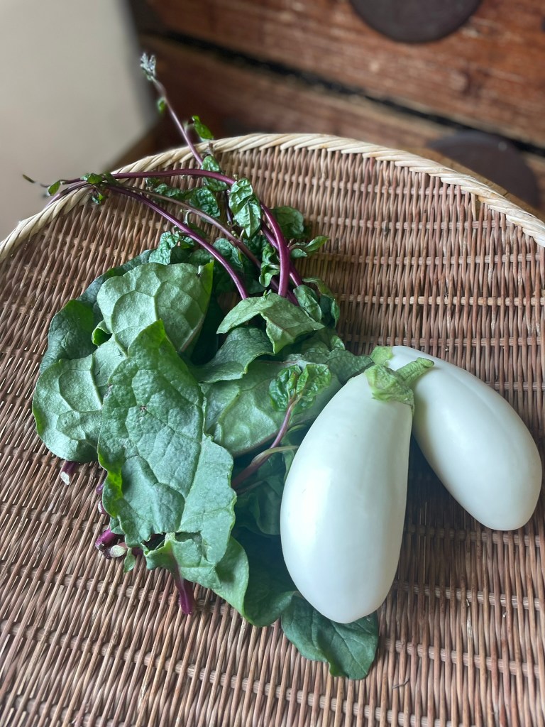 今回のお昼ごはんは、白い茄子やツルムラサキなどの夏野菜を使った韓国風料理にしました。
