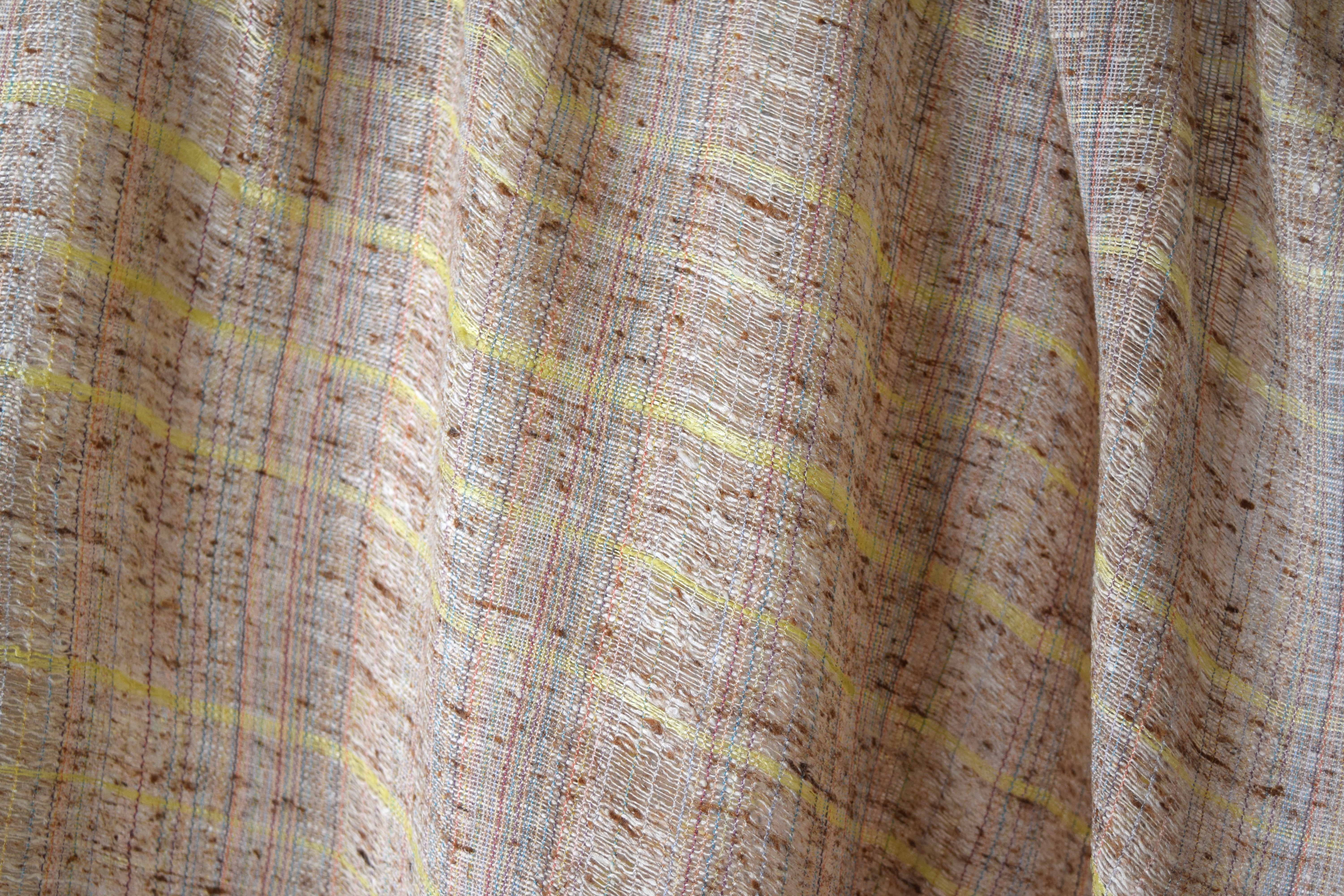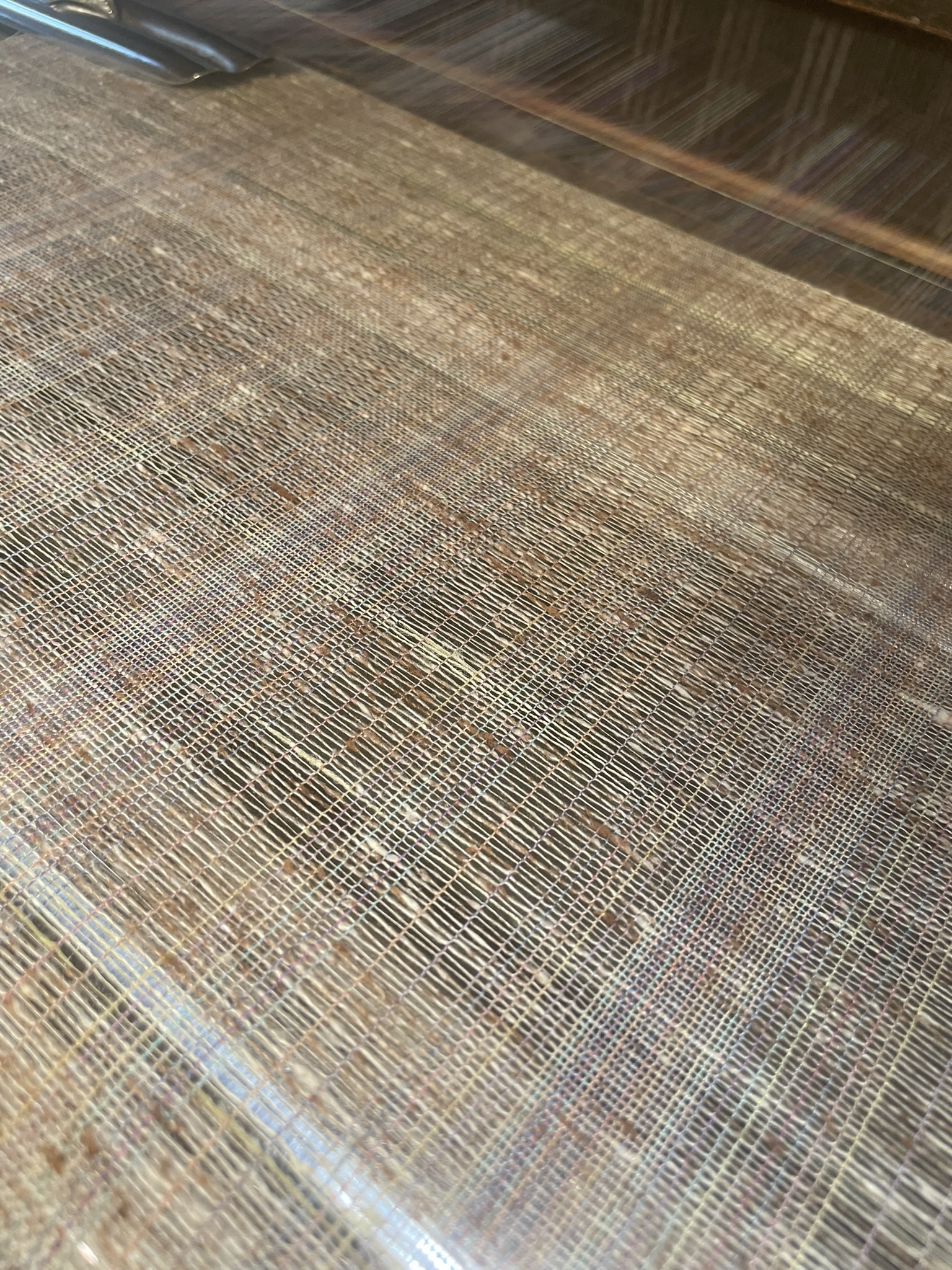 手紡ぎ絹真綿の糸にぜんまいの綿毛を絡ませた糸と、天蚕の糸を織り込んだからみ織り布です。