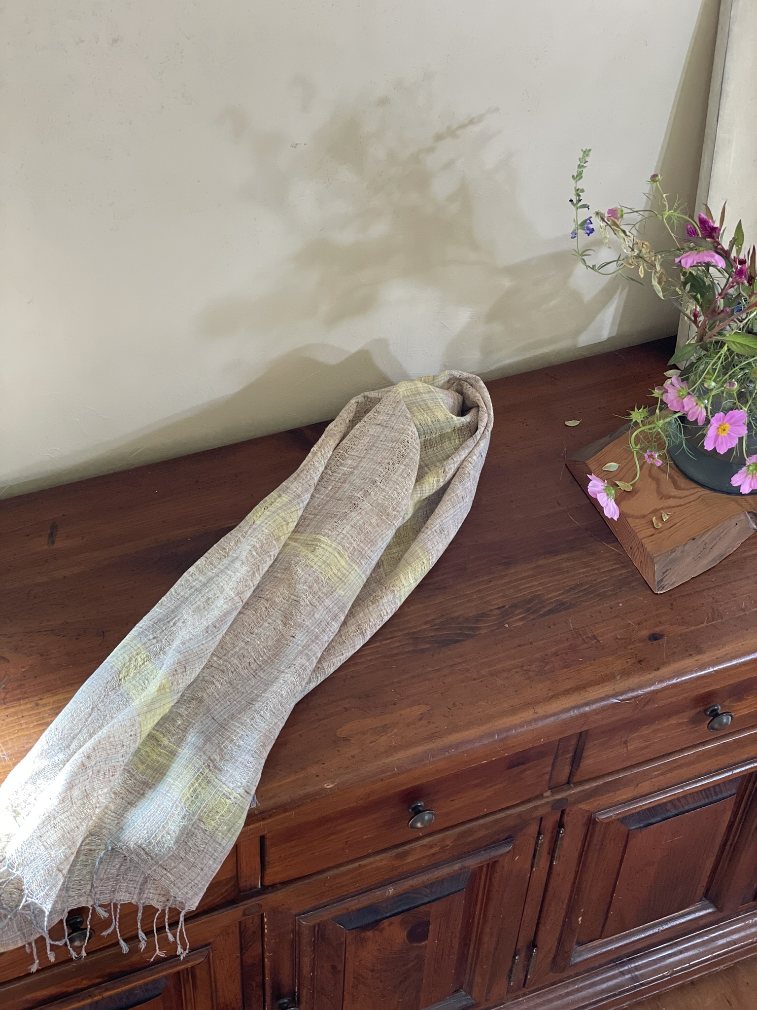 絹100%のさらっとした質感で、オールシーズン使っていただける大判のストールです。ぜんまいや天蚕糸独特の力強い野性的な風合いをお楽しみいただけます。やわらかさを出すために、ゆっくりとシャトル織機で織りました。