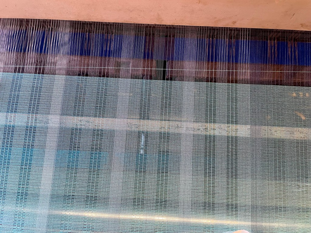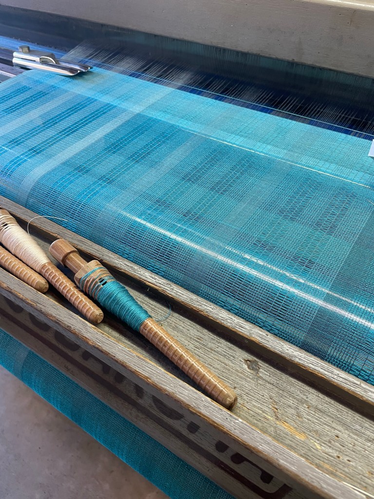 数日前に古いタイプの織機の初織りをしたので、今日はもう一台の織機を調整しながら初織りをしました。