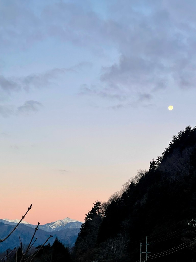 今朝は月と太陽の光で輝く山々をみながらのジョギング。気持ちが良かったです。