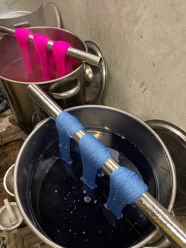 そして何度も染料を足しながら、ゆっくり色が糸にはいるまで染めていきます。染め上がりは色のトーンが少し落ちるので、自分の染めたい色よりも少し明るめにします。