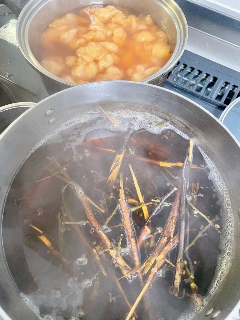 蛹出しの合間に、梅の枝染めの準備もしていきました。