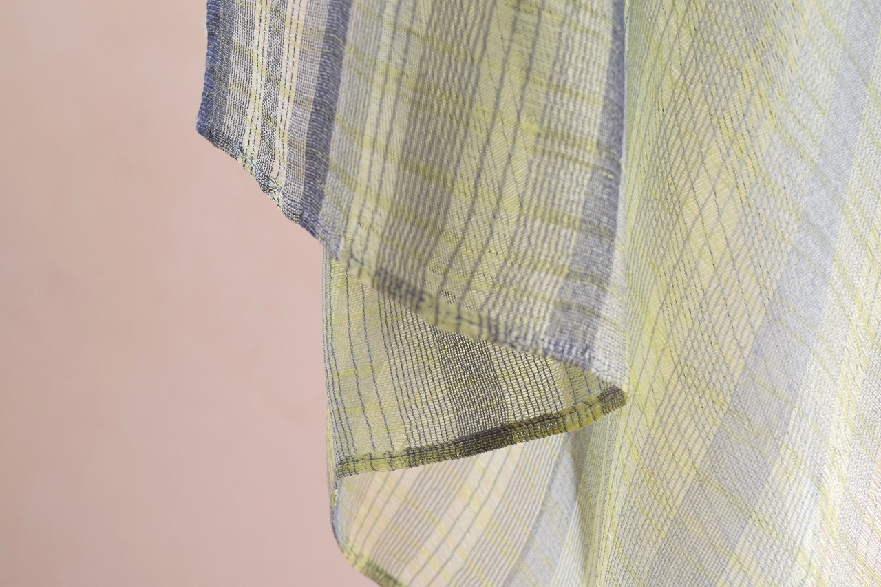 ミニマムなスタイルに華やかさをプラスするシンプルなストールをつくりたいというおもいで、デザインした絹・絹手紡ぎ真綿からみ織り布です。