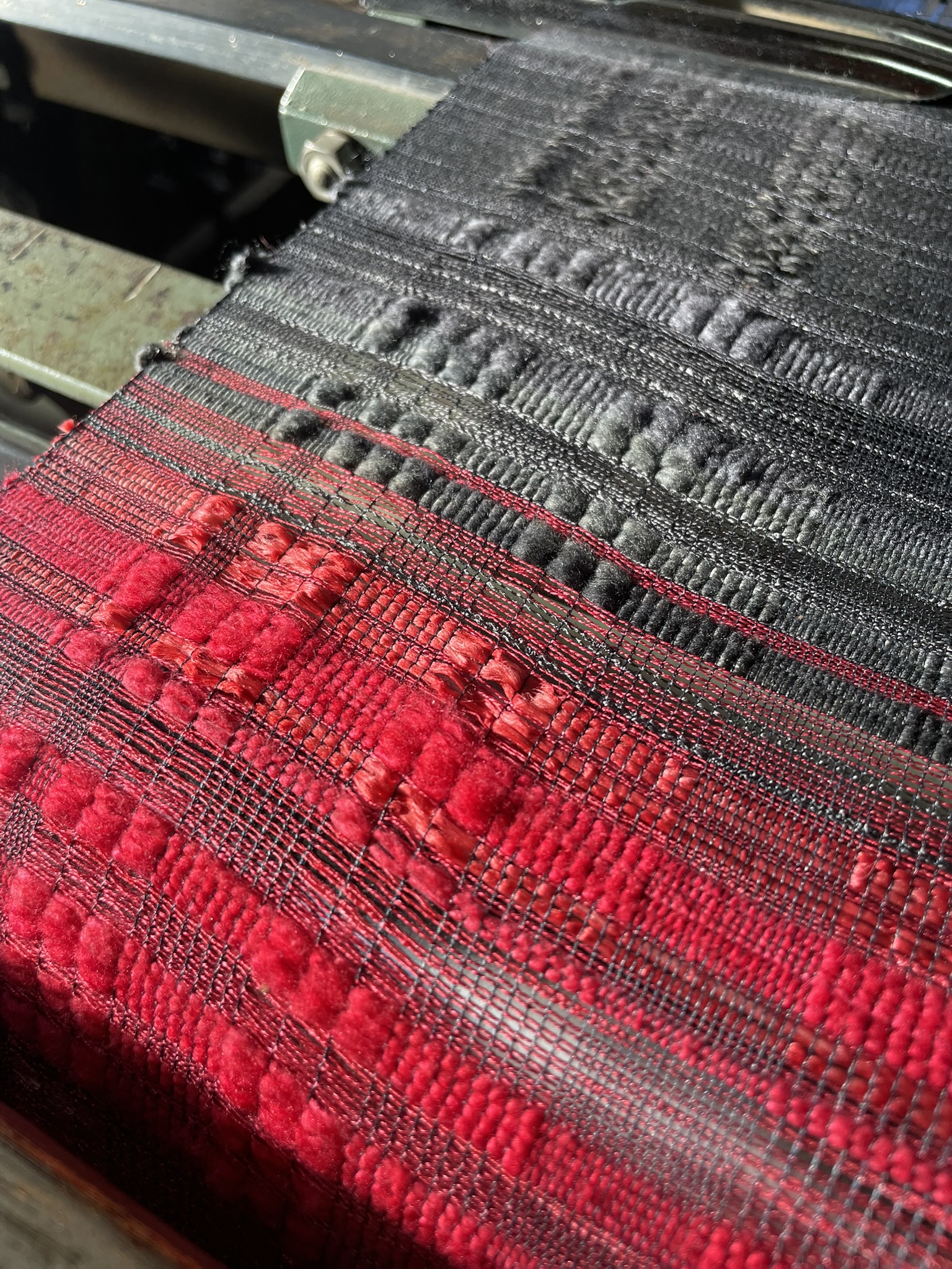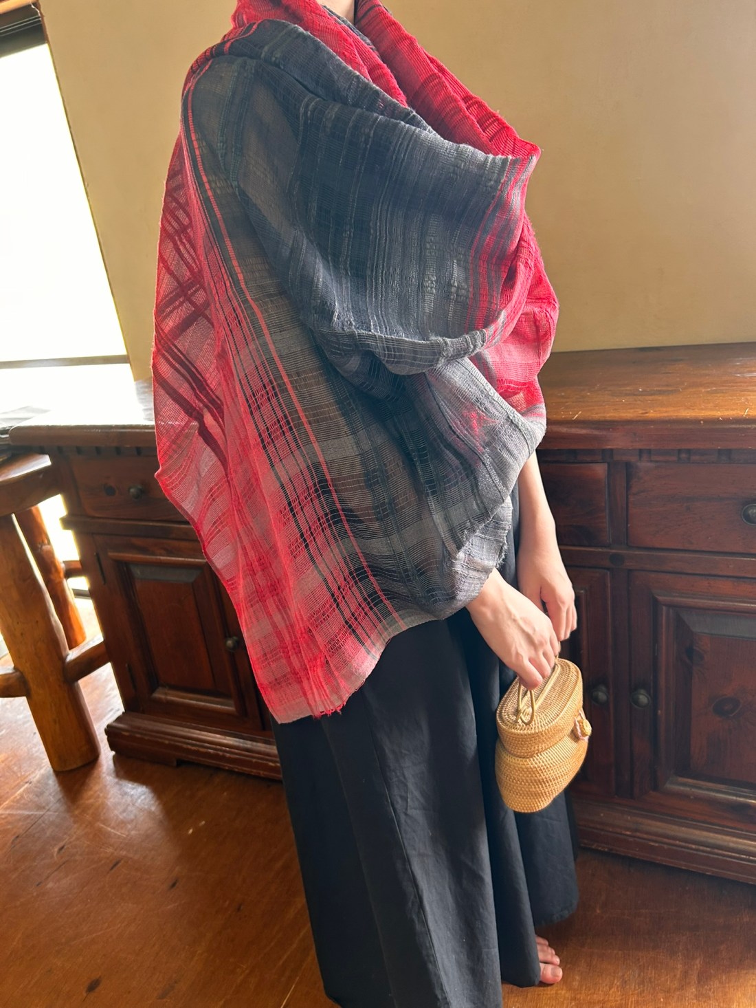 からみ織りの透けと密度のあいだで、赤と黒の気配が、光の角度によって静かに入れ替わります。