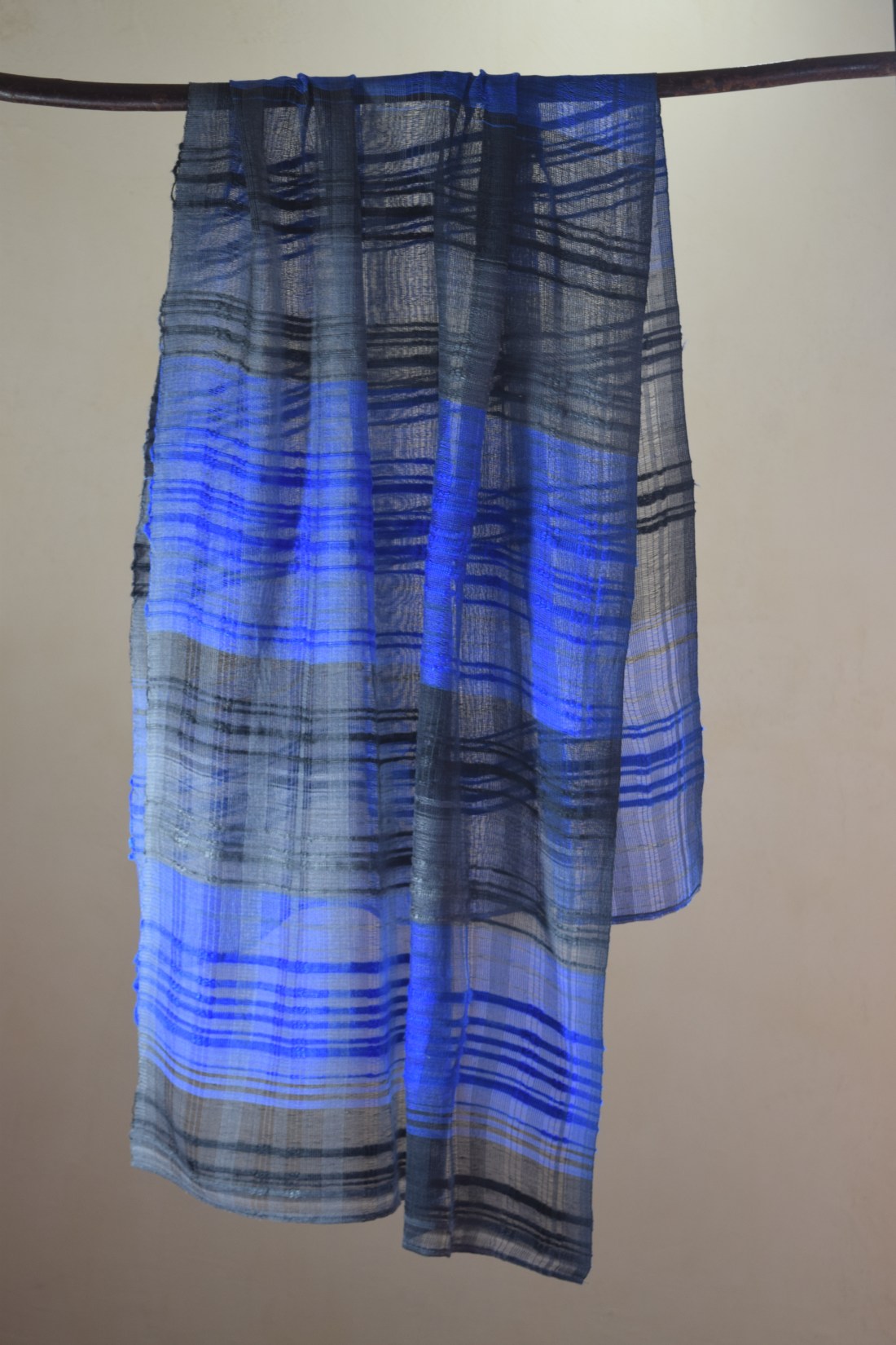 この作品では、特別な素材を加えるのではなく、絹正糸、絹強撚糸、太さの異なる絹真綿糸そのものの重なりから、青と黒の関係を織り上げました。