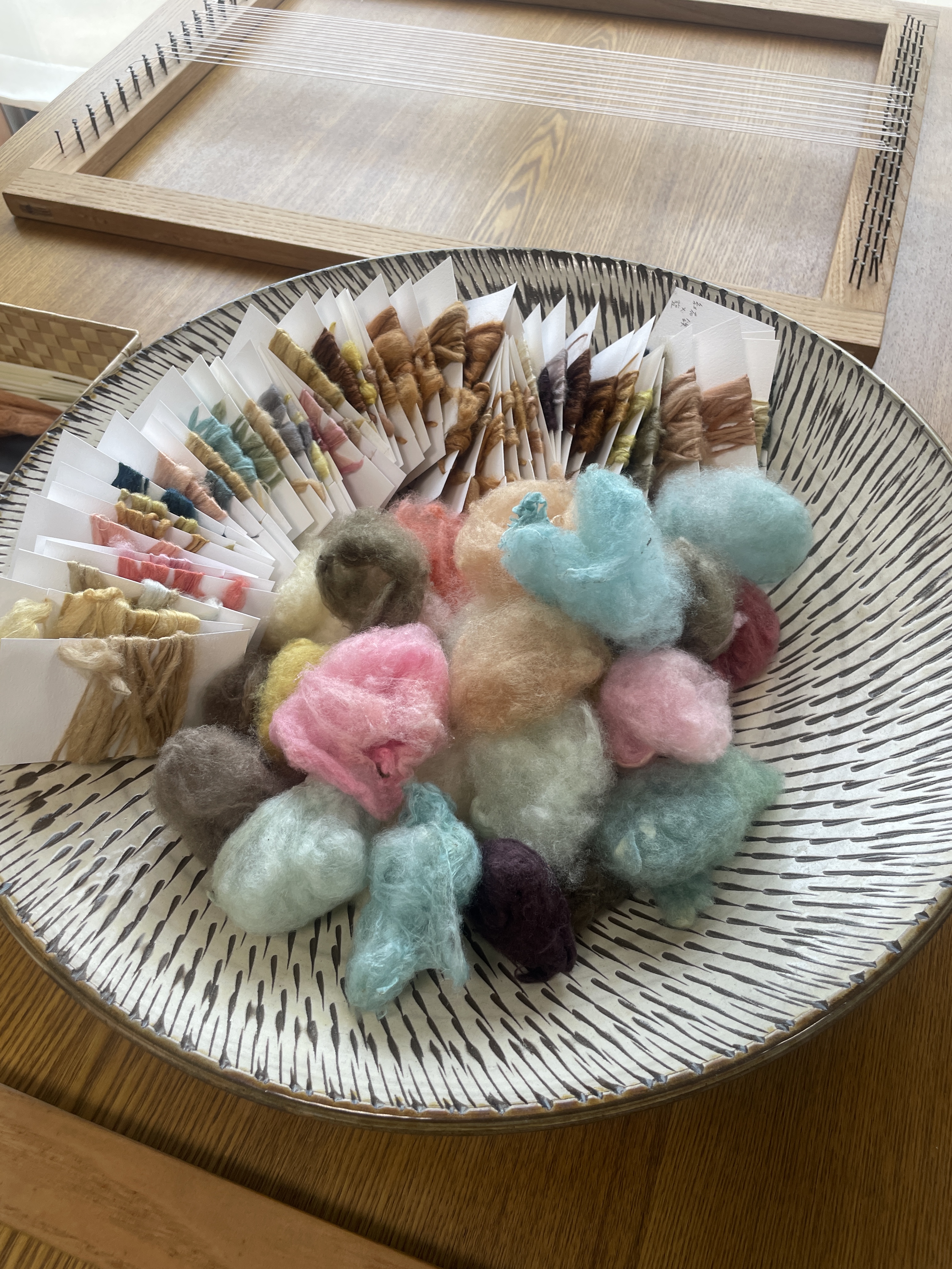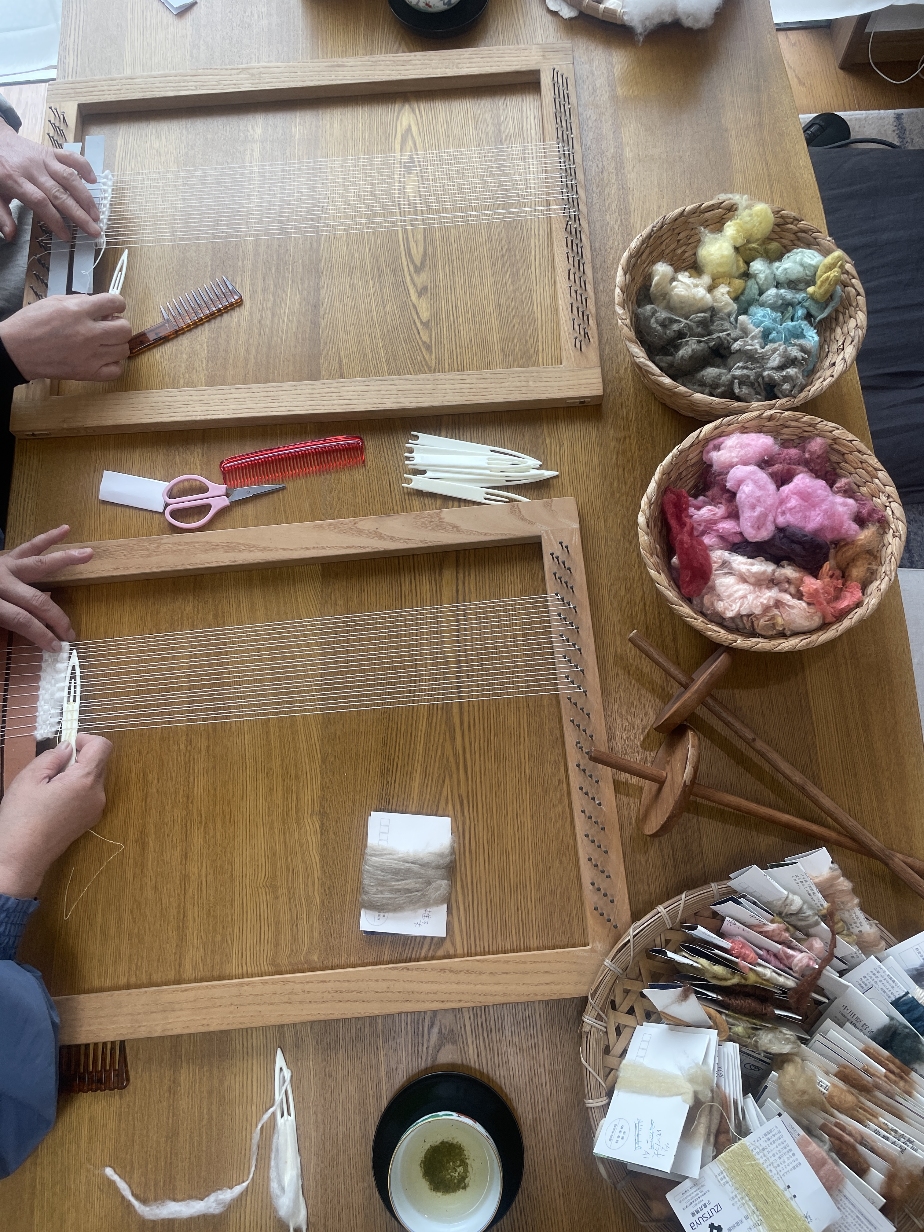 色とりどりの素材の中から、それぞれが真綿や糸を選び、木枠に小さな布を織るワークショップを行いました。