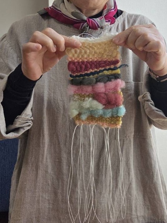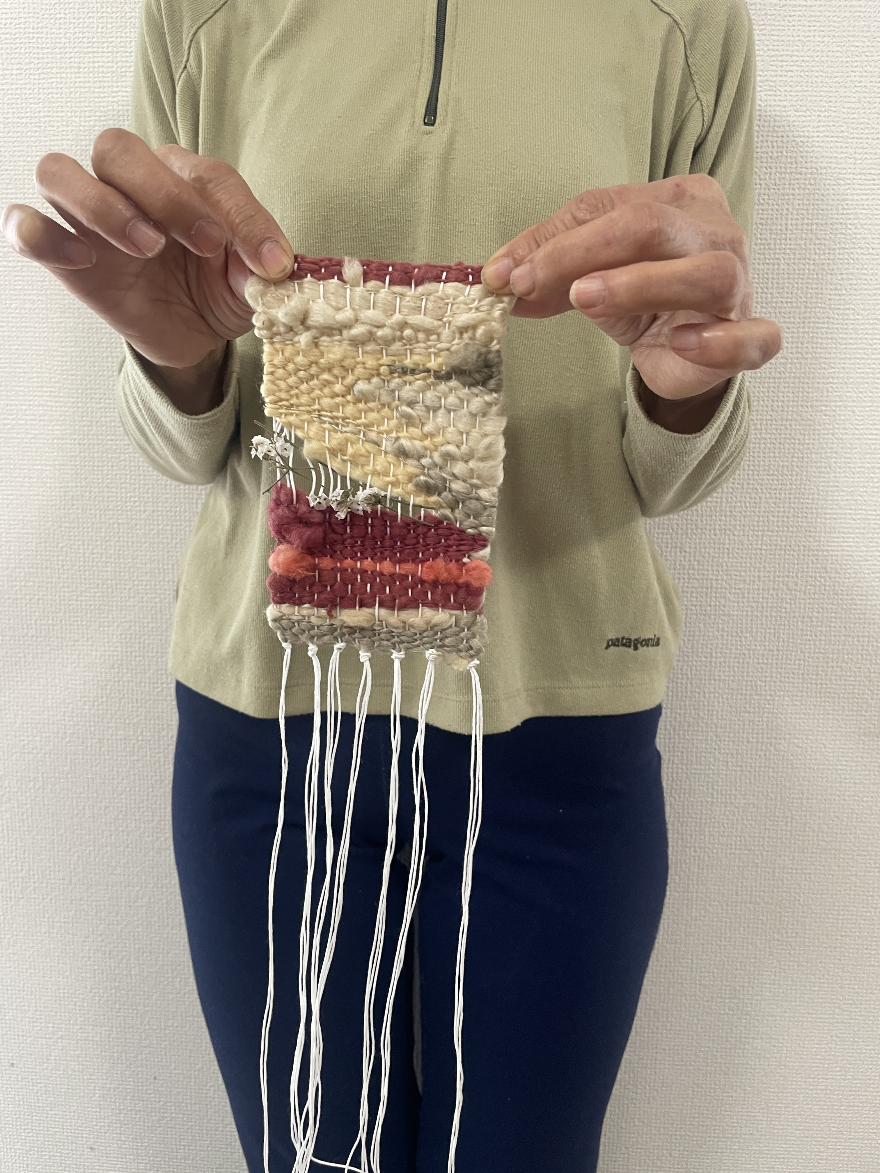 今回は、あらかじめ経糸を張っておいた木枠に、参加者の方が思い思いの色を緯糸として通していく時間でした。
