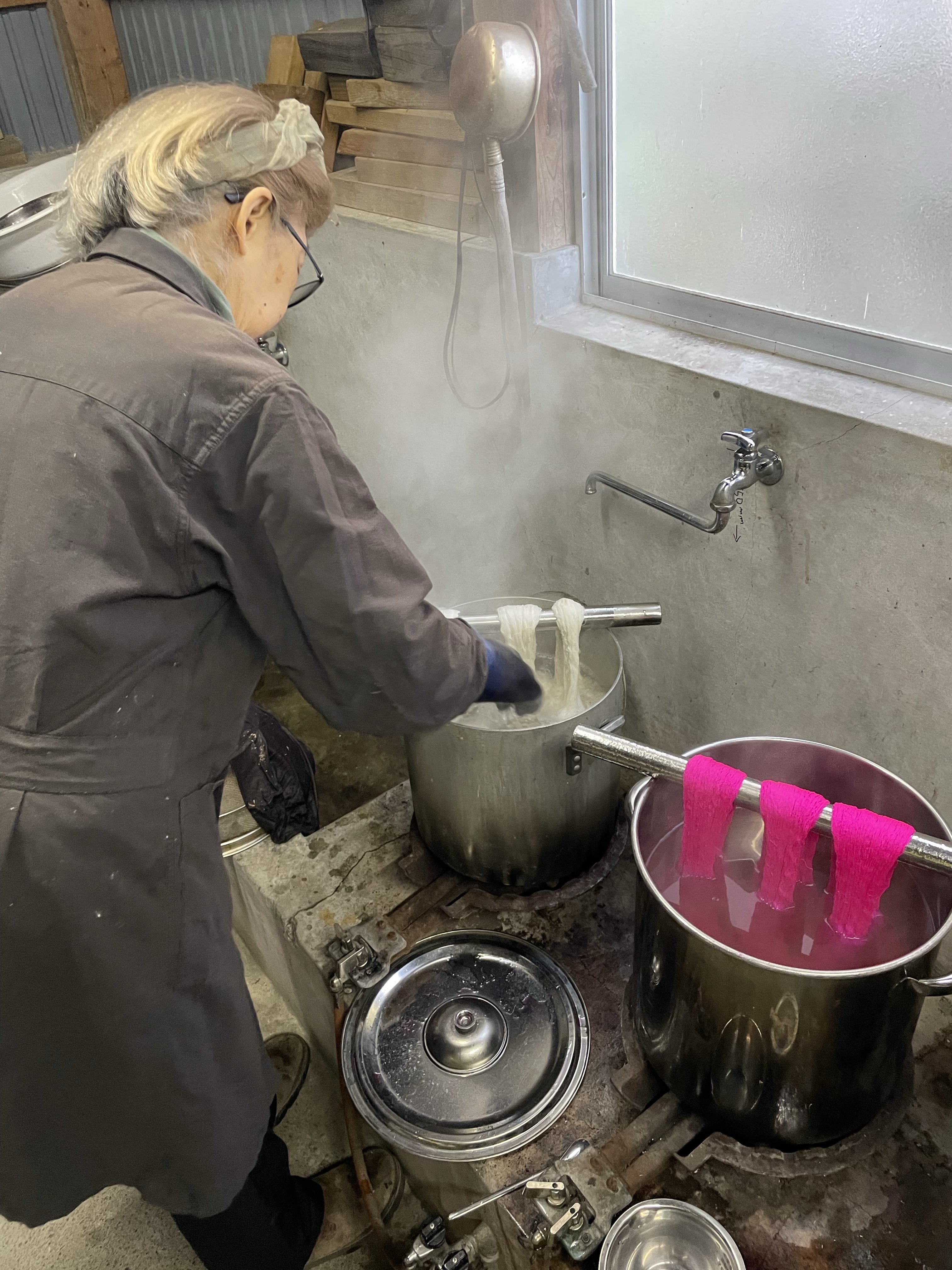 山梨に工房を構えるようになってからは、化学染料と植物染料を自分たちの手で扱い、素材に合わせて彩りを考える染織を行っています。分業から一貫生産へと変わることで、より自由に表現できるようになりました。