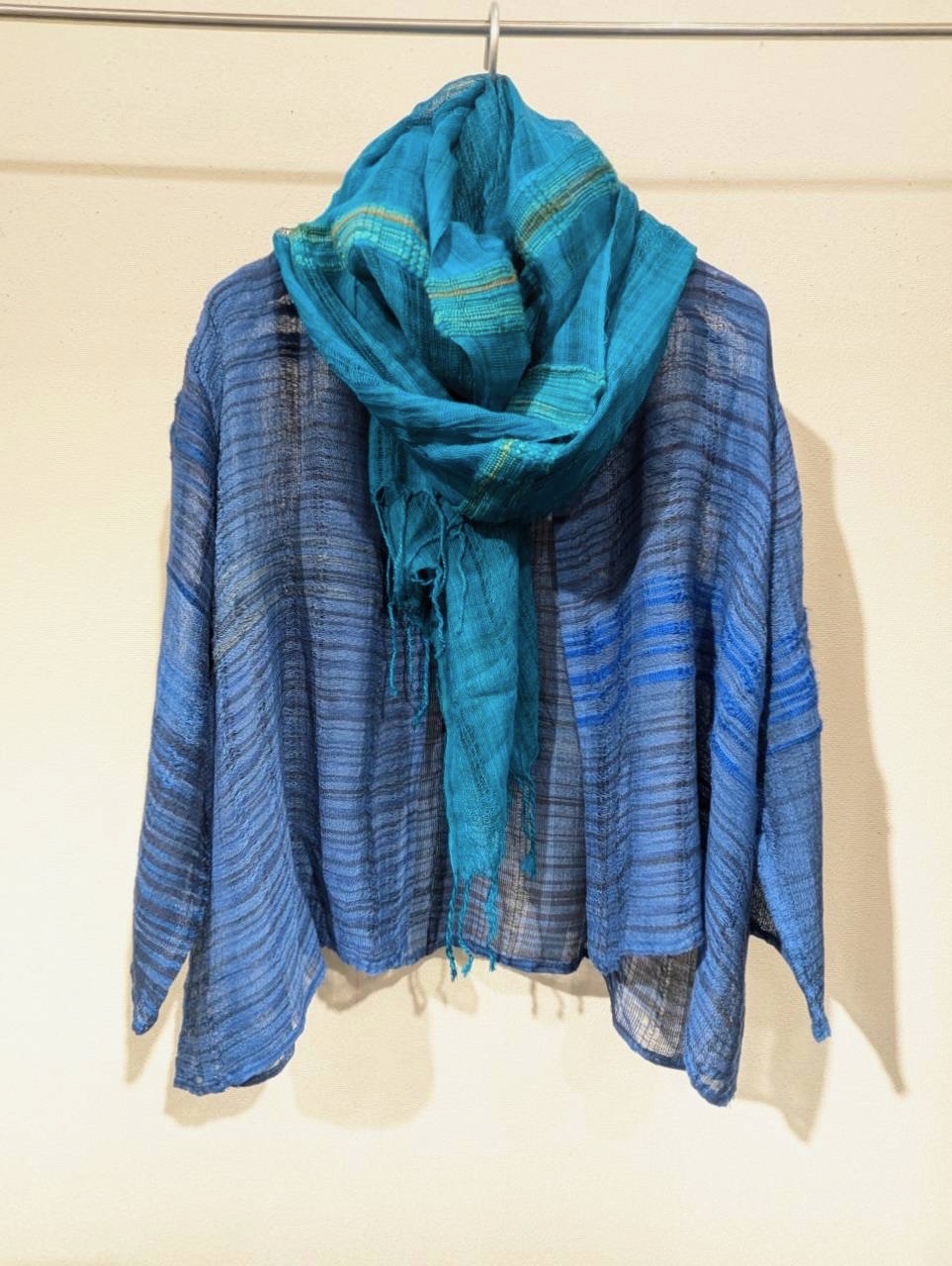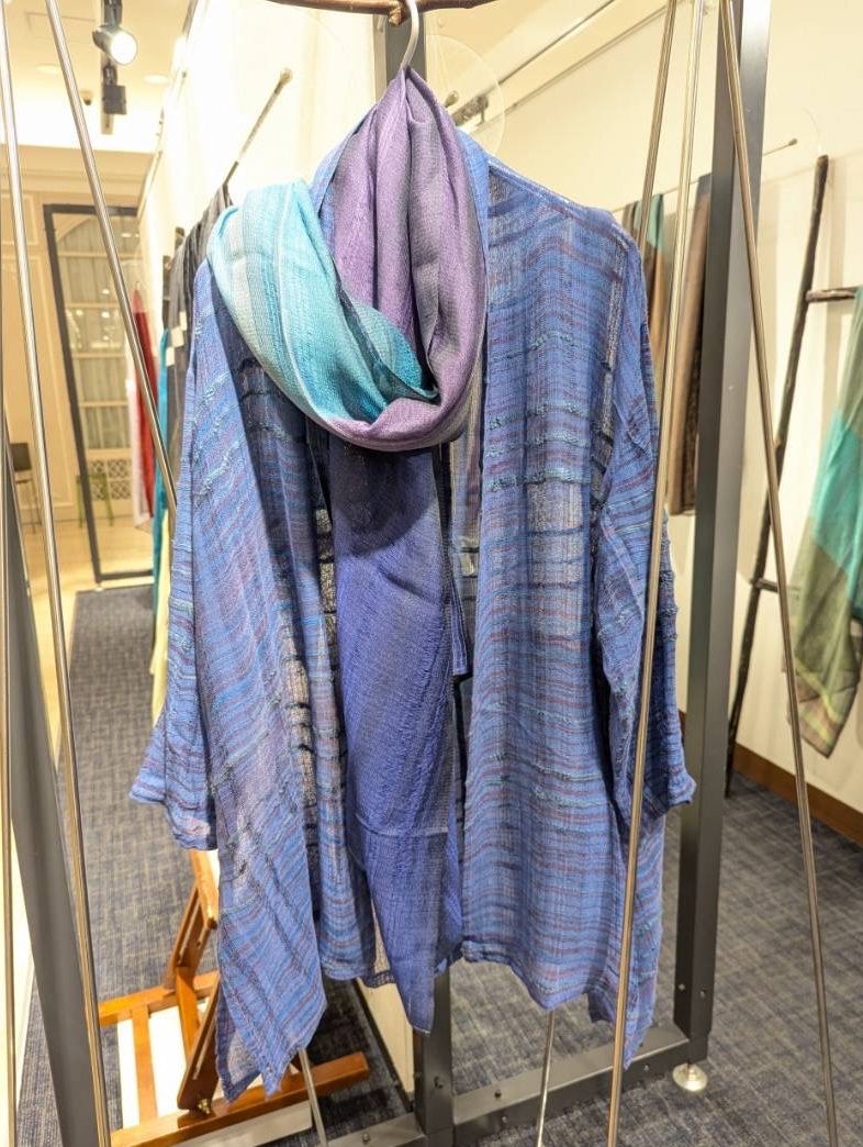 技法やシルエットは従来のままですが、数種類の絹糸を組み合わせ、さらに数色の糸を織り交ぜることで、ストールとしても十分見応えのある布をコートに仕立て、さらに後染めを施しました。