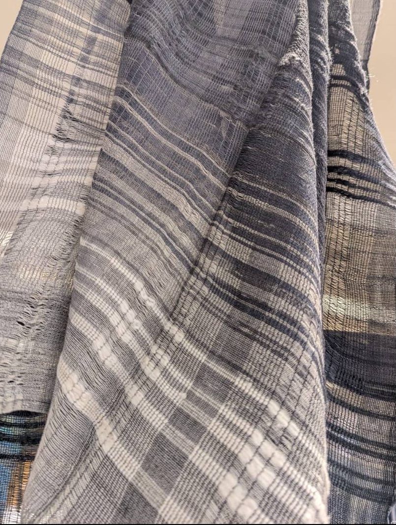 In the airy structure of leno weave, layers of black, gray, and white rise softly to the surface. Up close, the yarns speak to one another; from a distance, light slips through and the expression changes with your gaze.