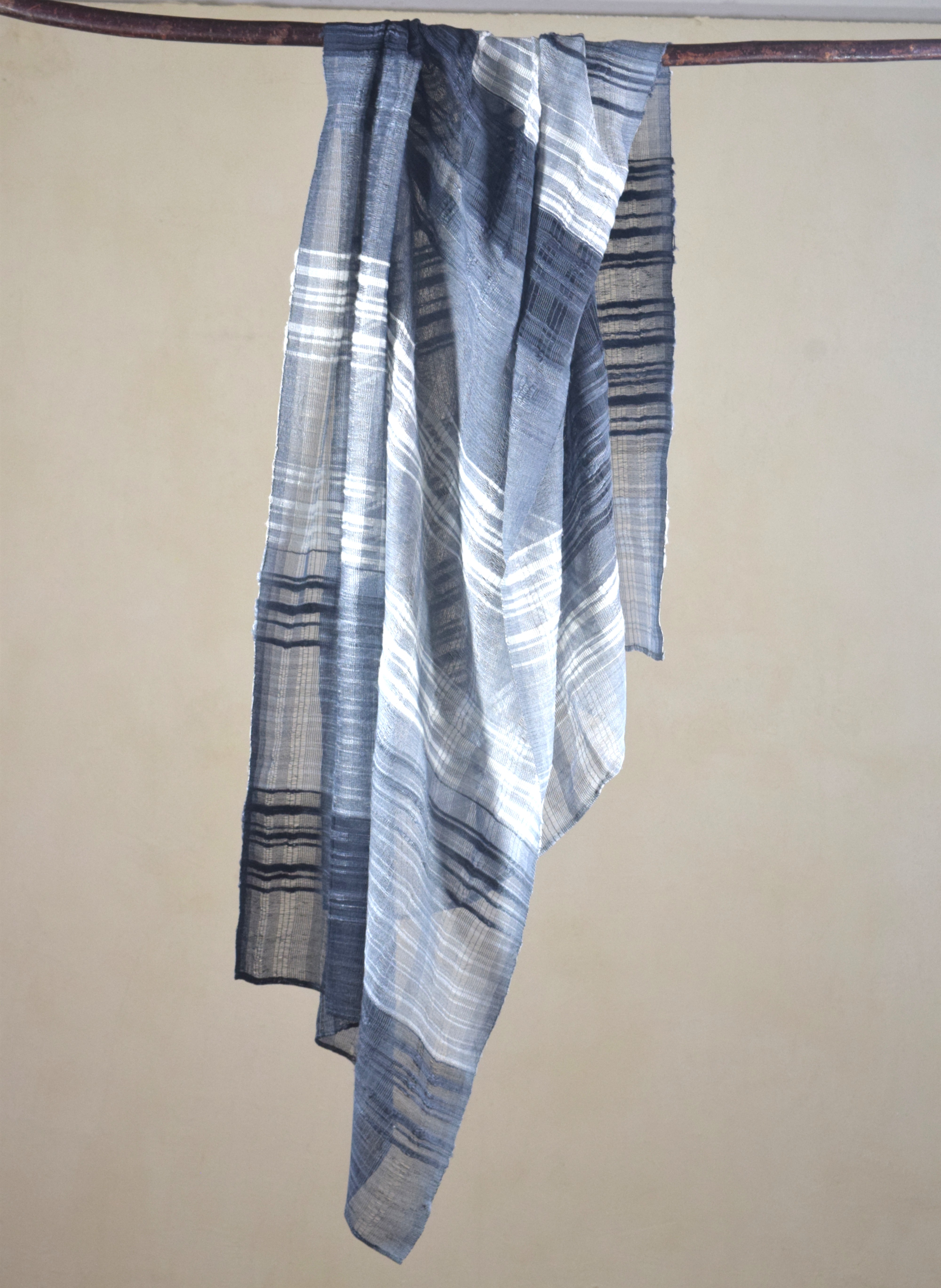 黒・グレー・白の糸が、からみ織りの中でゆるやかに交わり、布の中に静かな線の層をつくっています。黒の深さで終わらず、明るさへひらいていく、その移ろいがこの作品の中心です。