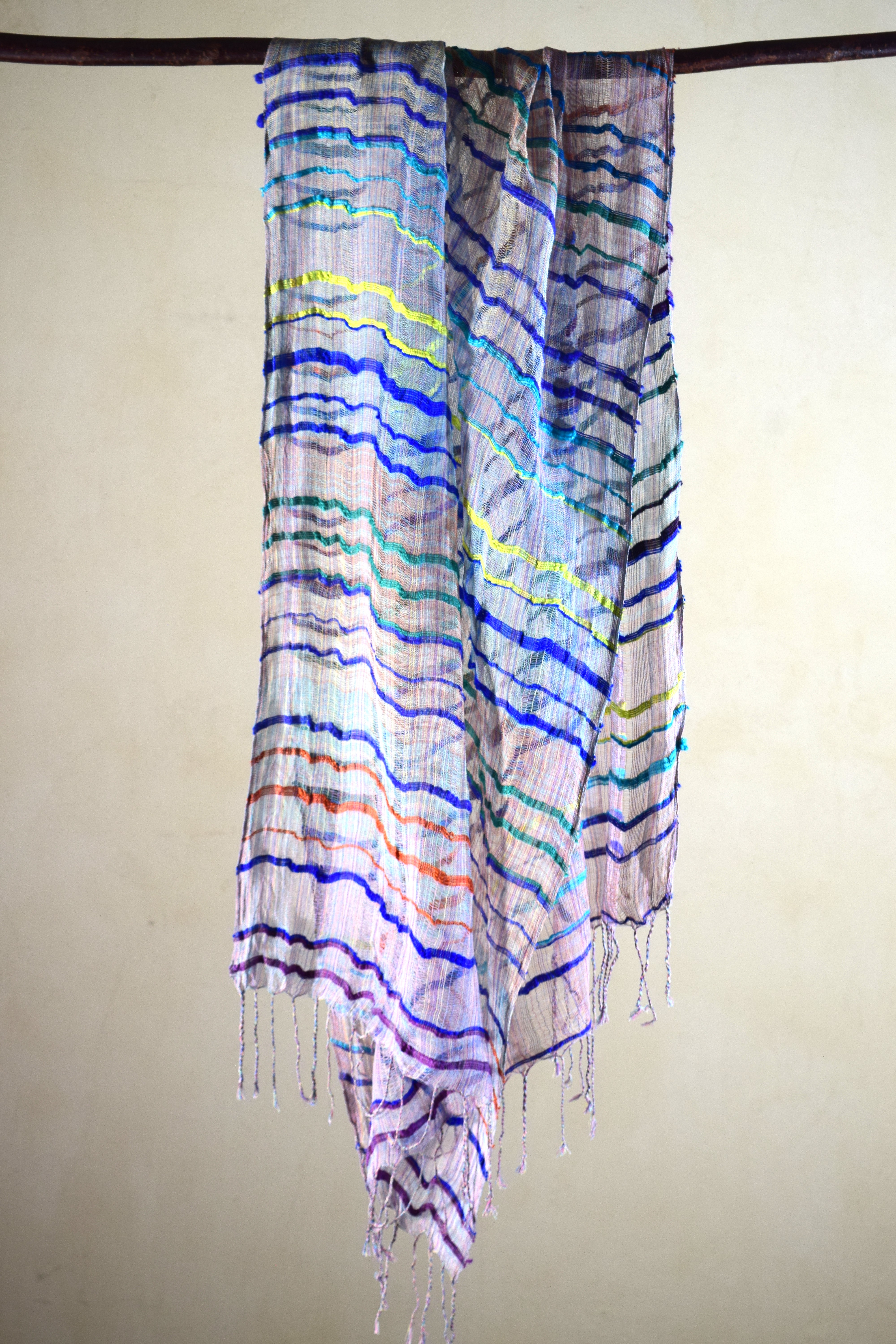 A one-of-a-kind leno-woven silk textile in which quiet light is crossed by lines of color. Blue, green, yellow, orange, and violet move lightly across the pale field, leaving a subtle rhythm within the cloth.