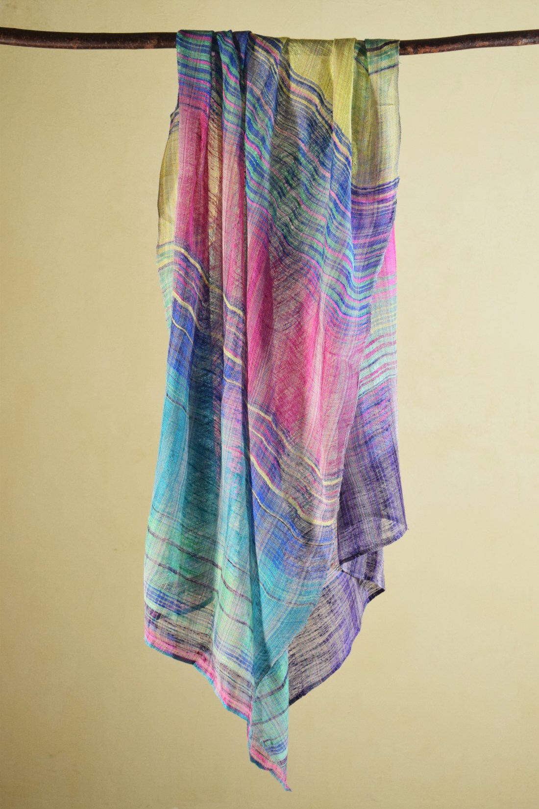 A one-of-a-kind textile in which pale yellow, blue, violet, and pink quietly overlap within a translucent field. Thin layers of color hold the light and leave a different impression each time it is seen.