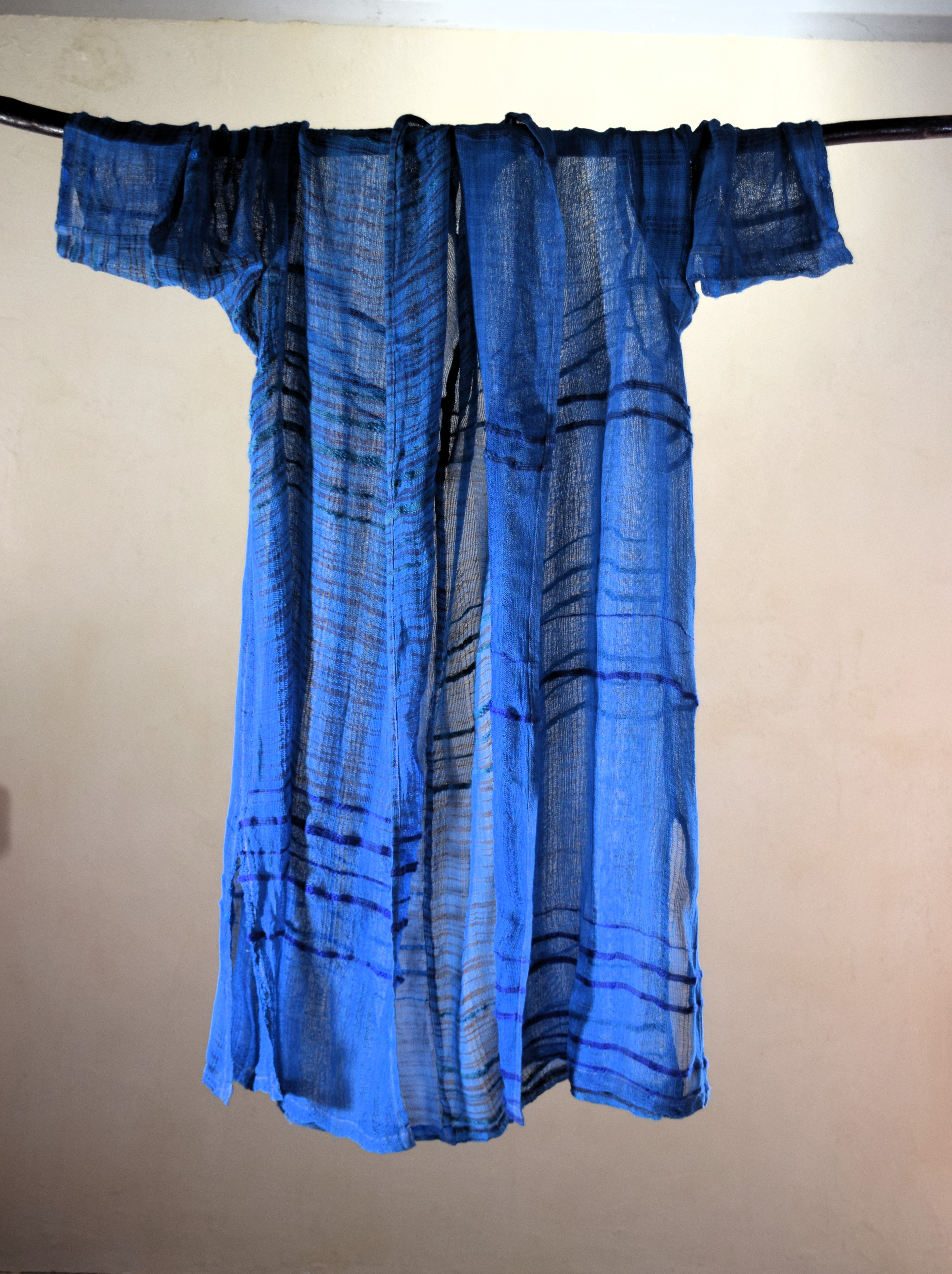 からみ織りは、糸の間に空気を含み、光を通し、動いたときに奥行きを生む織りです。《薄暮の記憶》では、その構造の中に淡い青の移ろいが現れ、時間帯や見る距離によって布の印象が少しずつ変わります。同じものは二度とつくることができません。