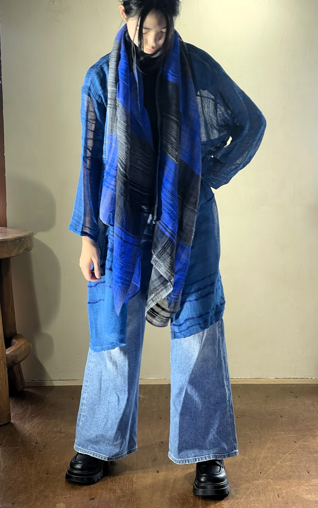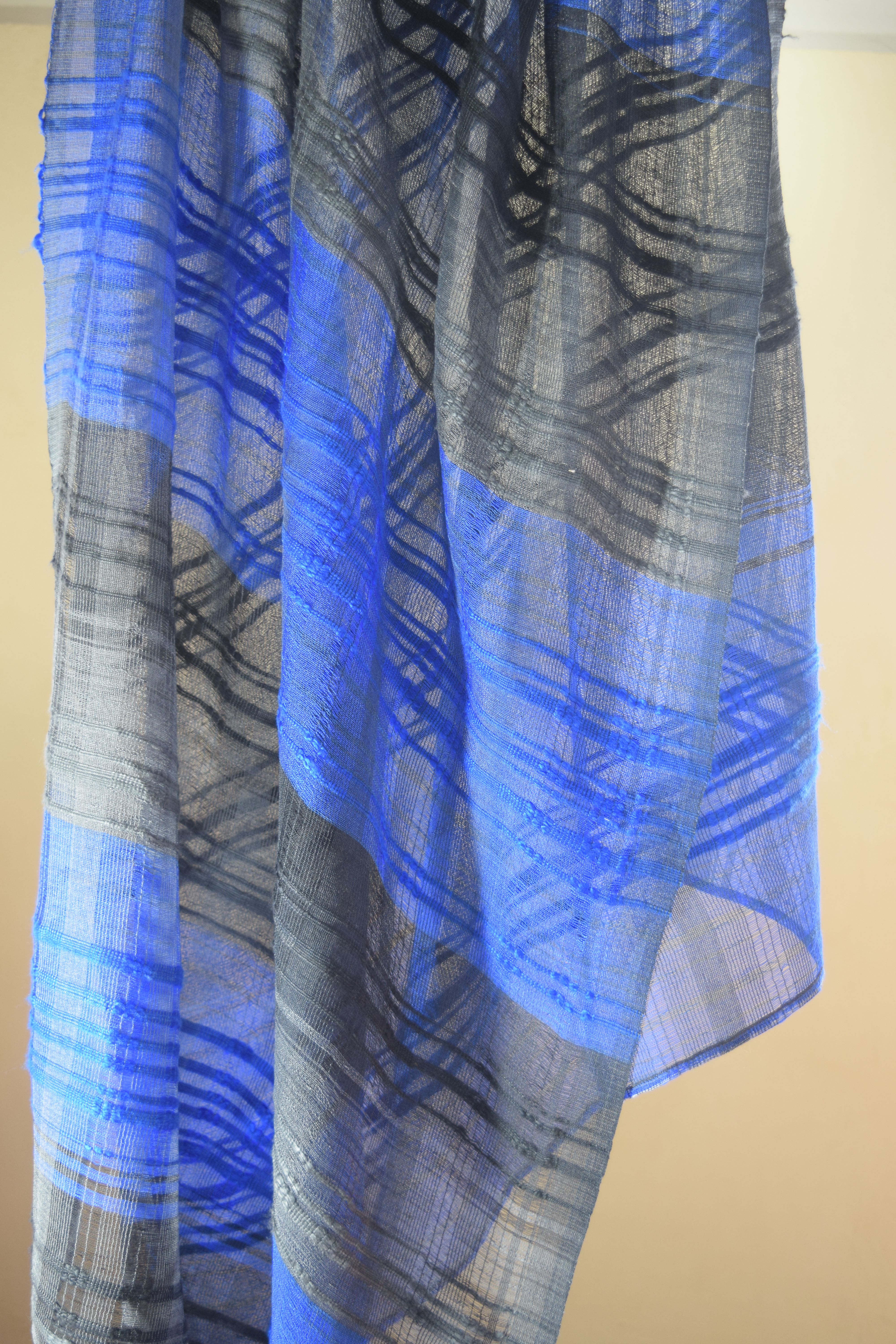 A one-of-a-kind textile in which luminous blue and deep black cross quietly within a translucent field. Lines of color move through the cloth, leaving a subtle sense of motion within stillness.